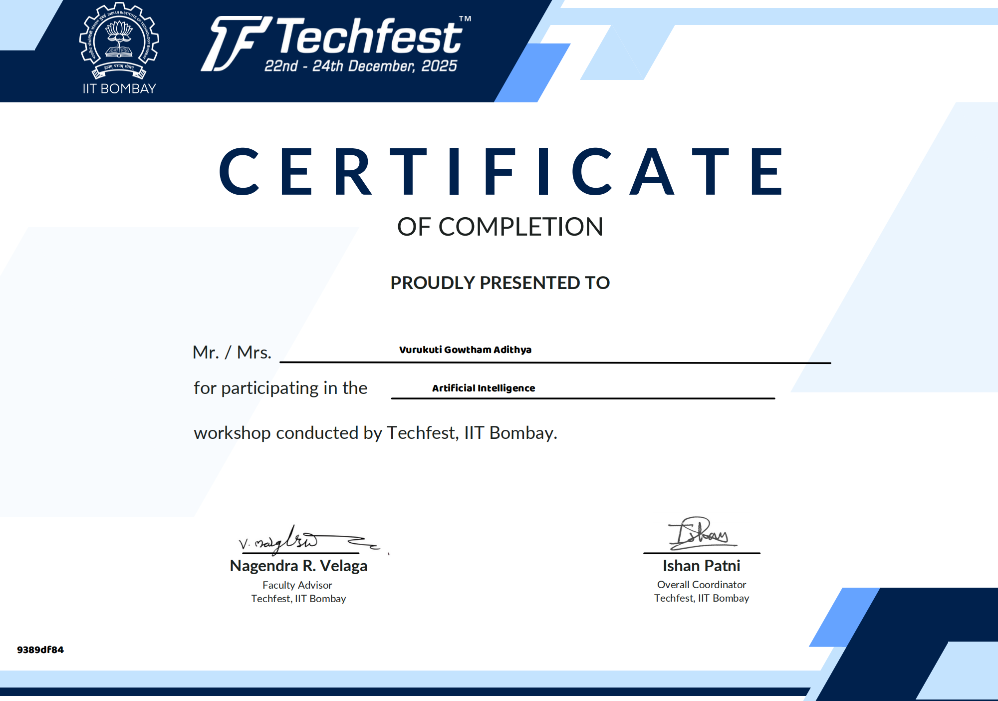 Participated in IIT Bombay Techfest workshop, gaining exposure to real-world AI systems and practices.